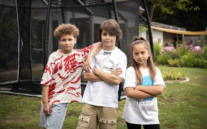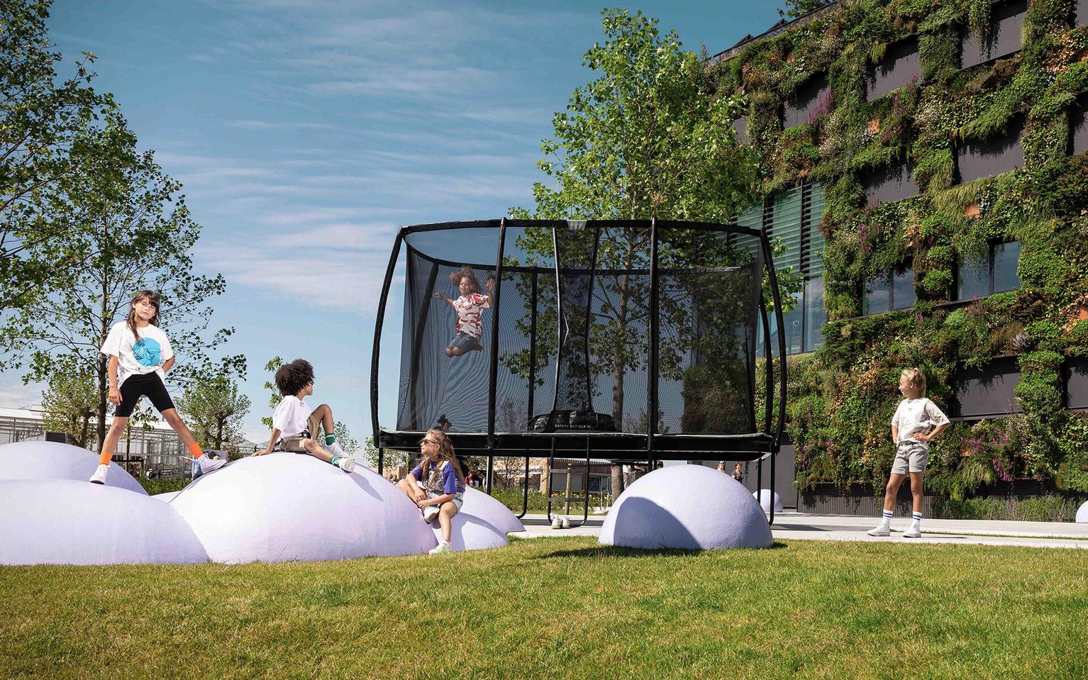 Banner met kinderen bij een BERG Champion ECO trampoline met net in een groene stadsomgeving