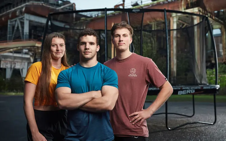 Drei Athleten posieren vor einem BERG Trampolin in einer Industrieumgebung