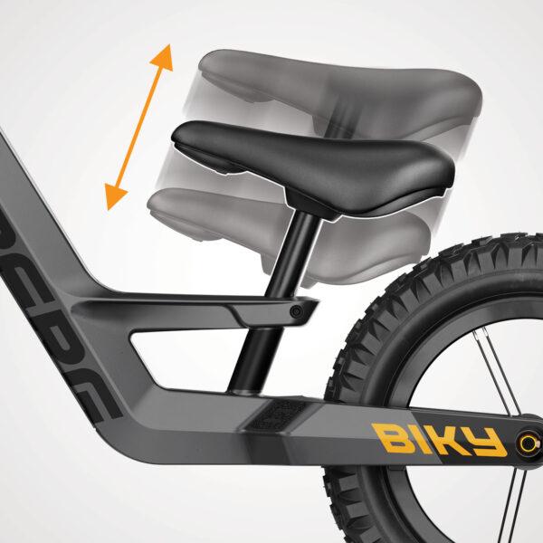 Grâce à sa barrière basse et à la hauteur de la selle ajustable, le Biky est facilement accessible et adaptable pour les enfants de 90 à 120 cm.