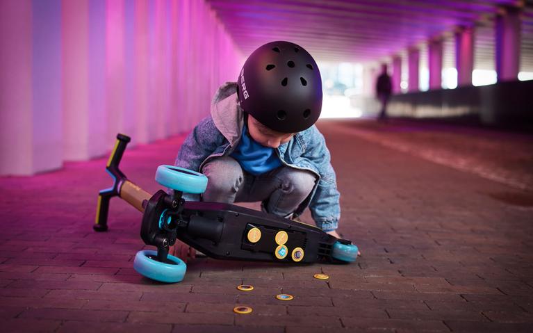 Child playing with magnets on the BERG Nexo scooter in a colorful tunnel banner