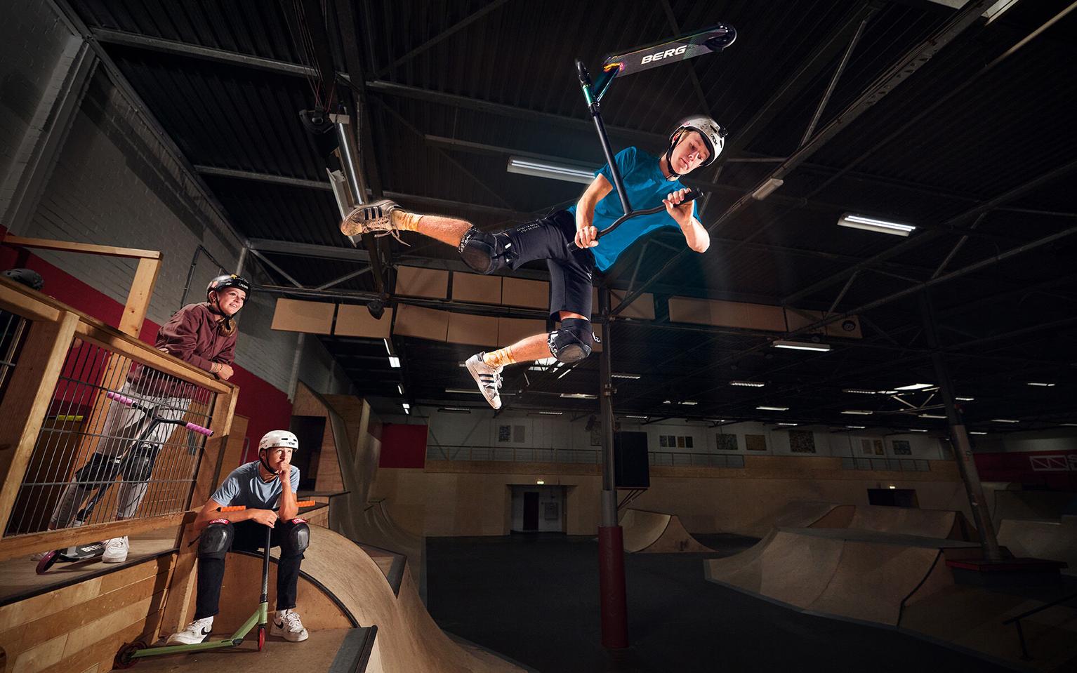 Teen jumping with the BERG Proxus X1 stunt scooter in an indoor skatepark