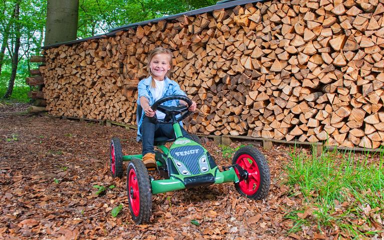 Niña sentada en un kart verde BERG Buddy en el bosque – banner comparativo