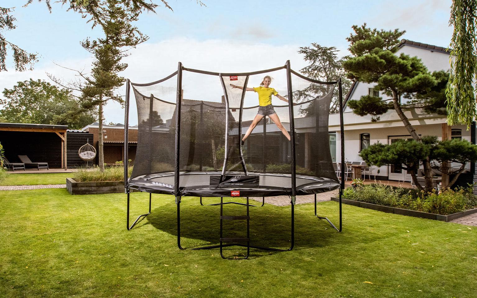 Banner con bambino che salta sul trampolino BERG Favorit con rete di sicurezza in un giardino moderno