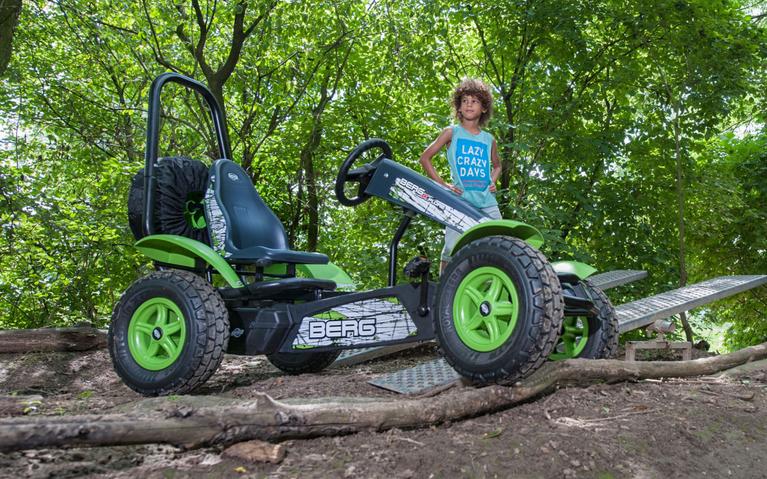 Gutt ved siden av en grønn BERG X-Plore trabil banner i et skogsområde